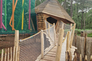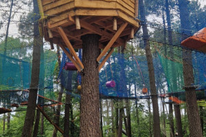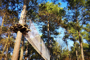 Mini parcours dans les arbres sans équipement, jeux sécurisés par des filets, tyroliennes, tyrolianes & trampolines.